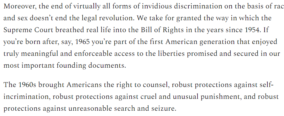 In part because of the power of those other voices, America has made great strides in becoming a more just and fair nation. Jim Crow is over. Invidious discrimination is largely banned. The Bill of Rights are more potent and enforceable than ever before /3: