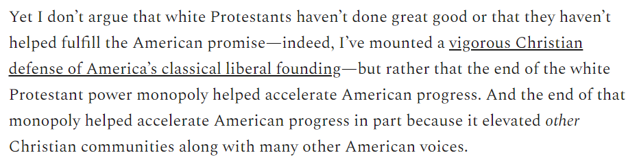 My key point isn't that America has gotten more just as it's become less Christian, it's that it's become more just as the white Protestant grip on power has weakened. That's allowed other voices to be heard, including other Christian voices /2: