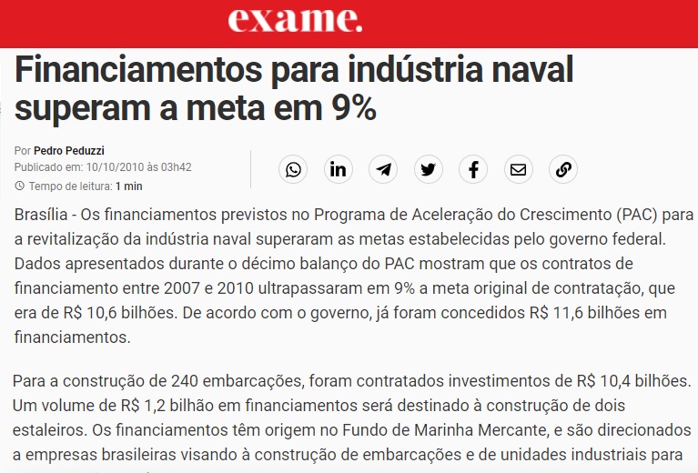 Mais de 11,6 bilhões de reais foram aplicados no fortalecimento do parque industrial naval brasileiro no âmbito do PAC. O Fundo de Marinha Mercante também foi reavivado, com a ampliação de recursos da ordem de 360%, chegando a 2,6 bilhões de reais em 2010.