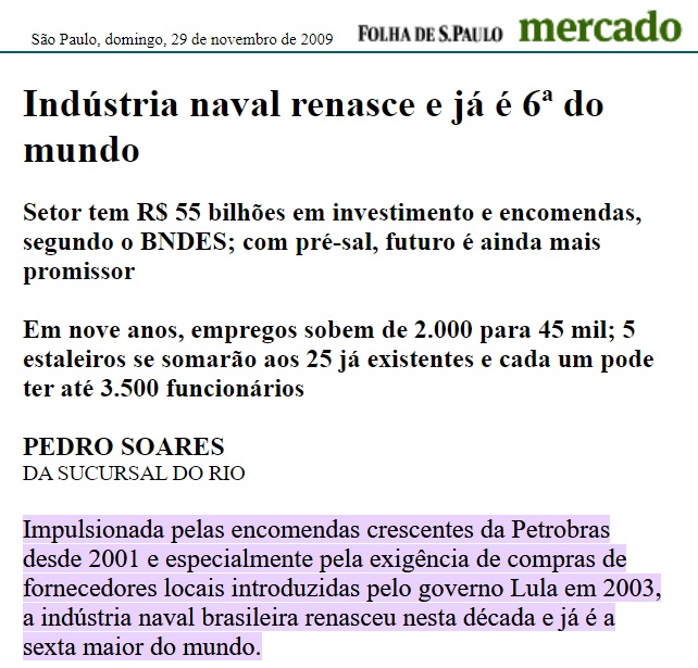 A priorização dos estaleiros nacionais na aquisição de navios e equipamentos de exploração e produção de petróleo e a política de conteúdo local permitiram a aplicação de 17,8 bilhões de reais na combalida indústria naval, levando ao ressurgimento do setor .