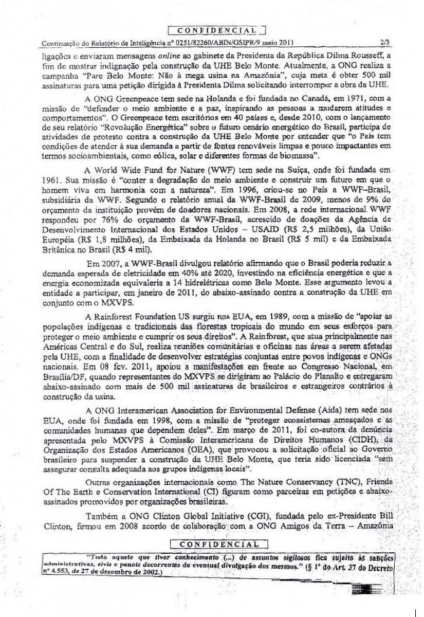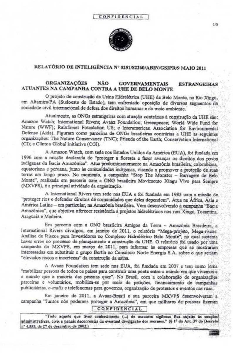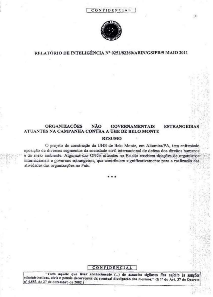 Em maio de 2009, a Agência Brasileira de Inteligência (ABIN) publicou o relatório confidencial nº. 251/82260, identificando as ONGs financiadas por governos estrangeiros e instituições internacionais que atuavam na campanha contra a construção da Usina de Belo Monte.