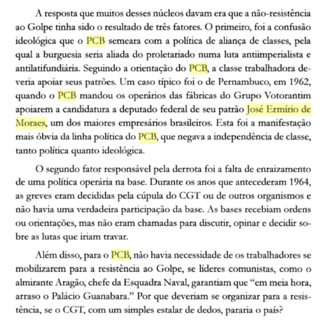 Na obra, o autor relembra o apoio do PCB à candidatura do empresário José Ermírio de Moraes ao Senado Federal em 1962. José Ermírio de Moraes era um dos homens mais ricos do mundo à época, proprietário do Grupo Votorantim, da Companhia Nitro Química Brasileira e da CBA.