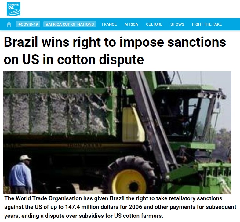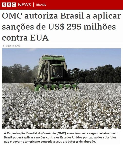 O governo brasileiro recorreu à Organização Mundial do Comércio (OMC) alegando que os EUA haviam fornecido mais de 12 bilhões de dólares em subsídios irregulares aos produtores de algodão, mantendo o preço artificialmente baixo e prejudicando os países periféricos.
