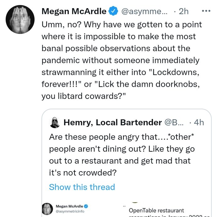 It seems obvious now in retrospect but it really is just purely binary to these people; taking the barest minimum precautions (e.g. an "indoor mask mandate" where guests can remove their masks to eat and drink") is tantamount to unfettered totalitarianism in their minds
