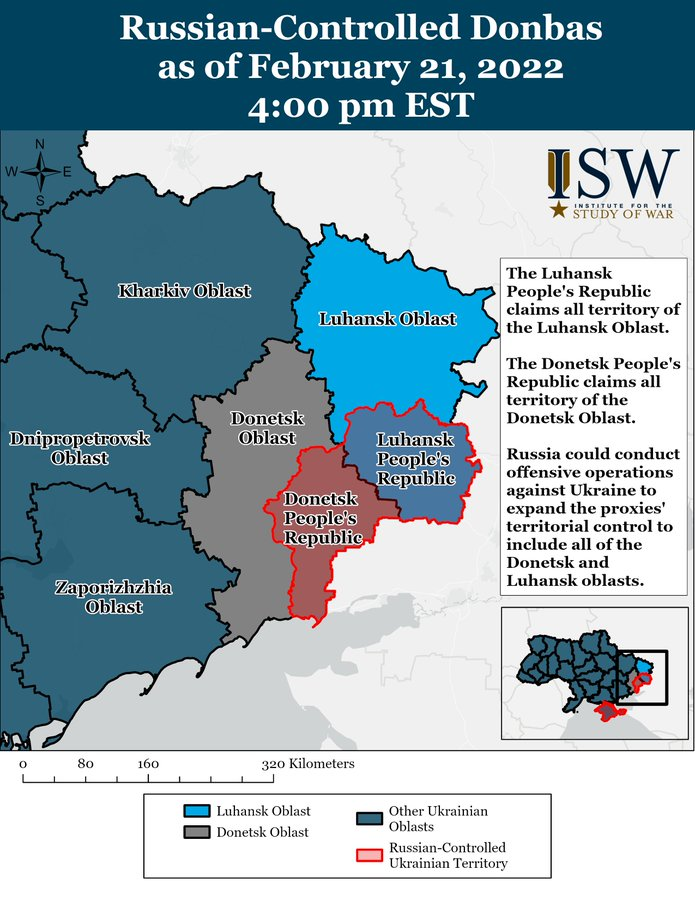 A propósito del tuit anterior, un mapa. El problema es que el reconocimiento de la Rusia de Putin a las repúblicas separatistas especifica que incluye el territorio que estas definen en su constitución: las provincias de las que toman el nombre enteras.