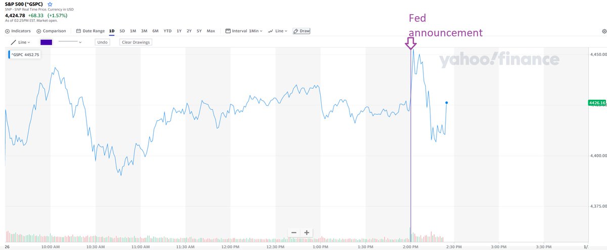 It looks like you could say that stocks rose and fell after the Fed announcement. Or they stayed the same. Depends on your event window, really.