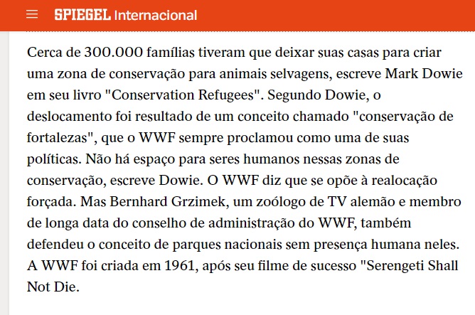 Em 2012, a revista alemã Spiegel International publicou uma longa matéria denunciando como as ações da ONG conservacionista WWF serviam mais aos interesses financeiros do grande capital do que ao meio ambiente.