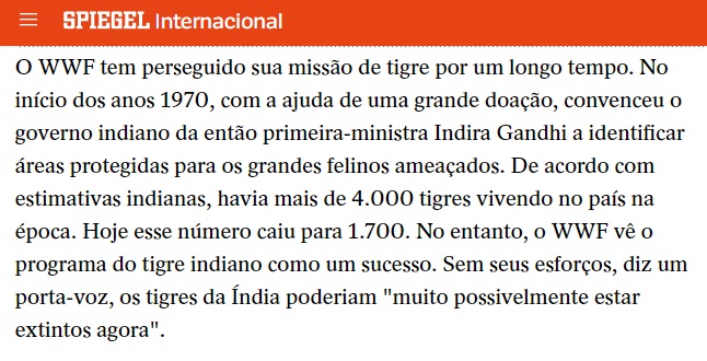 Algumas décadas depois, a ONG faturou rios de dinheiro com contratos de manejo, "exploração sustentável" e administração da reserva que visava "proteger os tigres". Mas a população de tigres no local caiu de 4.000 em 1970 para 1.700 nos dias de hoje.