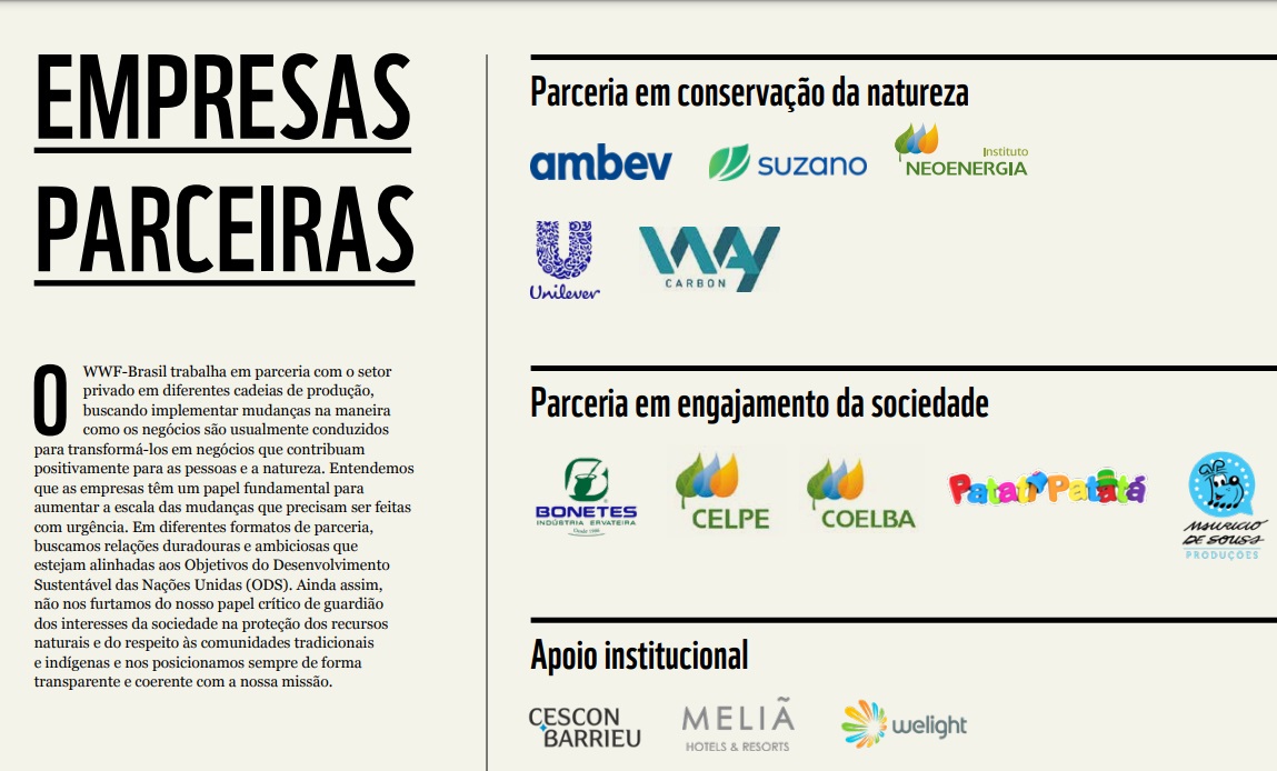 Na prática, a WWF age como uma agência de "greenwashing", usando de sua imagem de ONG conservacionista para emprestar um verniz de "sustentabilidade" às corporações que agridem o meio ambiente. Em troca, a ONG recebe apoio financeiro e doações generosas.