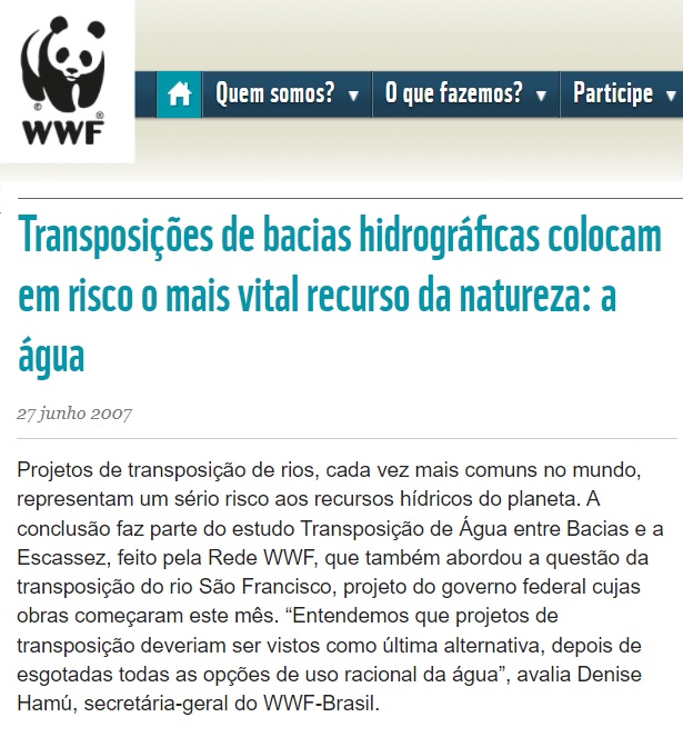 Até bem recentemente, a WWF era bem conhecida pelo seu ativismo político e seu forte engajamento na oposição a projetos de desenvolvimento tocados pelo governos petistas, como a Transposição do São Francisco e a Usina de Belo Monte.