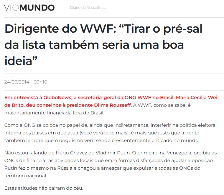 A WWF também manifestou forte oposição à exploração do pré-sal, quando se previa o uso dos royalties para financiar educação, saúde e infraestrutura. Não obstante, desde que a exploração foi entregue às corporações americanas, o incômodo parece ter desaparecido.