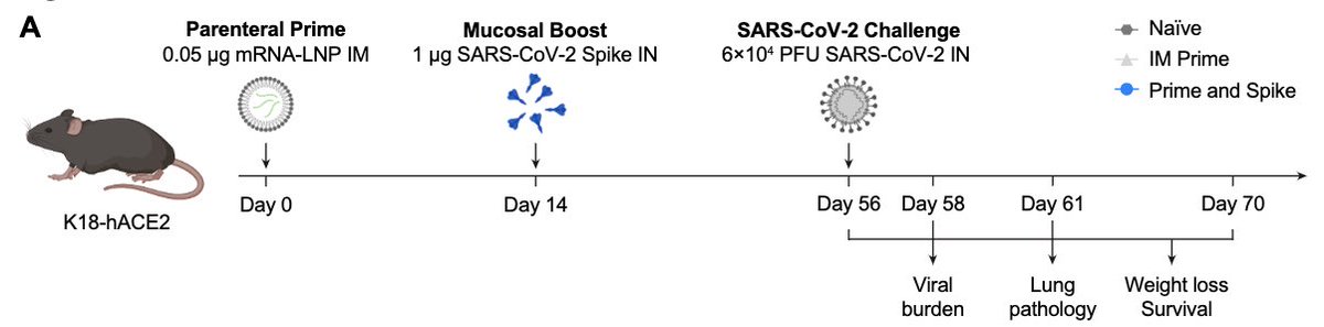 So how well does Prime and Spike work compared to Prime alone? To mimic waning immunity, we gave very low dose of mRNA IM to prime the mice, then boosted nasally with Spike. 42 days later, they challenged mice with a lethal dose of SARS-CoV-2. (9/)