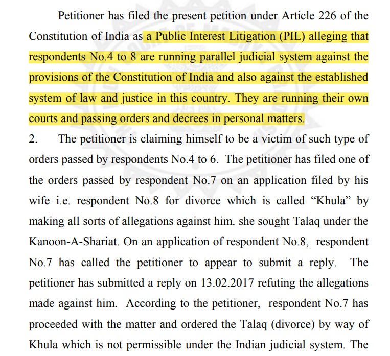 Adil (the petitioner) had alleged that on his wife's application for divorce by "Khula" under 'Kanoon-A-Shariat', the Chief Quazi of Darul Kaza Chhawani, Indore, (#MadhyaPradesh) had granted the Talaq despite his opposition which is 'not permissible' under Indian judicial system.