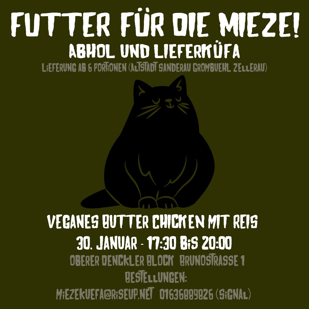 Am Sonntag, den 30. Januar wird es von 17:30 – 20 Uhr richtig geiles Essen – veganes Butter Chicken mit Reis – gegen Spende geben.