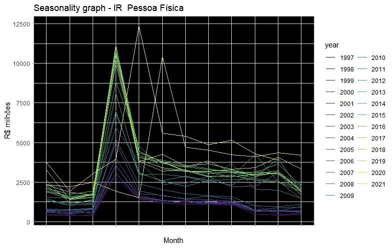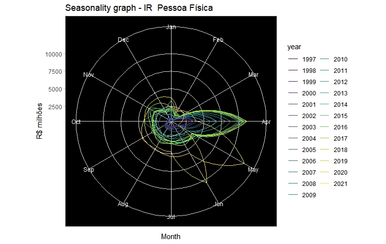 E que tal investigar comportamentos sazonais? Olha só essas duas opções de gráficos. Aqui testando a sazonalidade de receitas pelo IR de pessoa física. (9/n)
