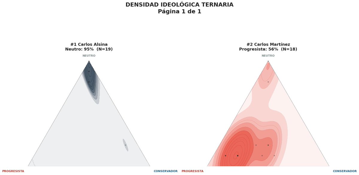 3- La distribución ternaria refleja la probabilidad que la IA asigna a la carga ideológica. Queda bastante claro el perfil de cada entrevistado.
