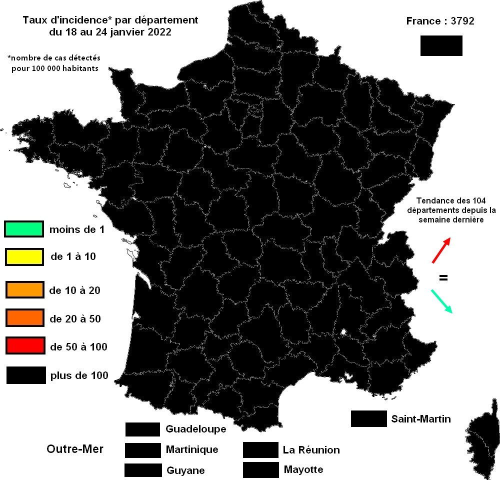 Carte du taux d'incidence par département (nombre de cas détectés pour 100 000 habitants sur les 7 derniers jours disponibles, ici du 18 au 24 janvier 2022).