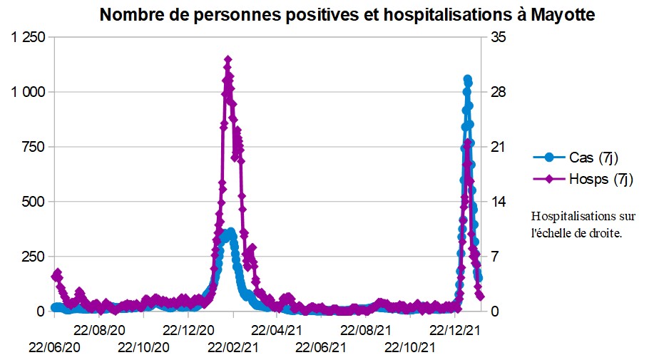 Mayotte se dirige vers la fin de la vague. Taux d'hospitalisation sur cas recensés divisé par ~4 par rapport à la vague de B.1.351 l'année dernière.