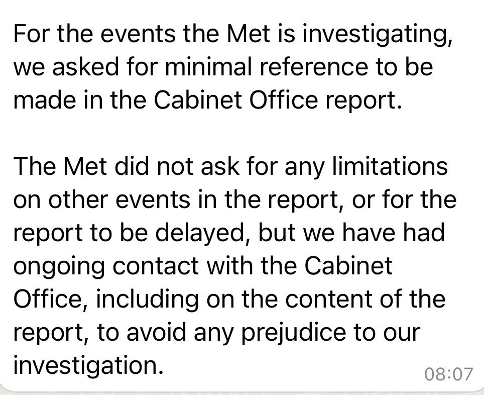 NEW: Met Police issues statement saying they want “minimal reference” to No 10 parties they’re investigating in Sue Gray’s report - explains why it still hasn’t been published.