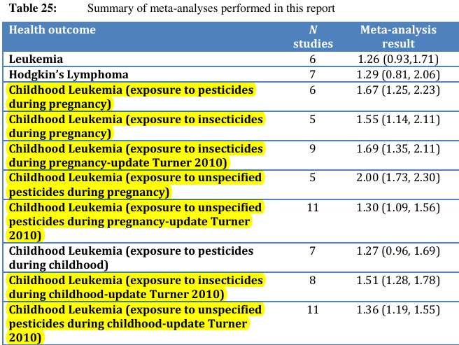 Pour les personnes qui veulent prolonger un peu. On trouve déjà des résultats nets sur l'effets des pesticides sur les leucémies de l'enfant dans cette méta-analyse qui a près de 10 ans (2013).