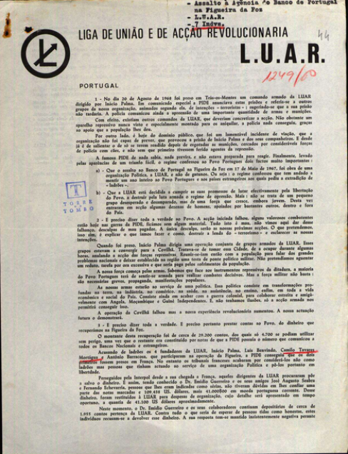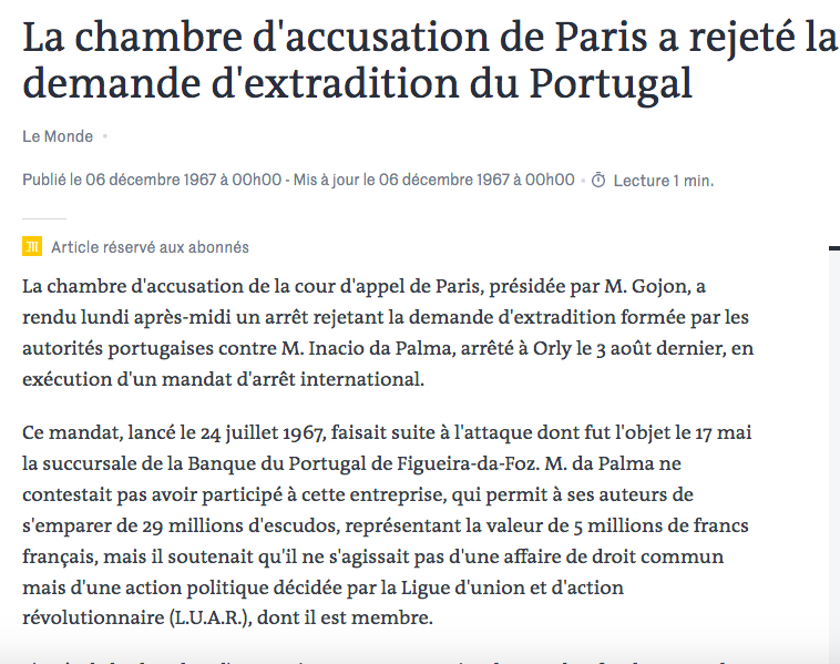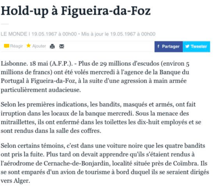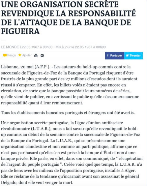 Le 20 mai 1967, coup de théâtre. Le Monde publie un article où un certain mouvement - la Luar (Liga de União e de Acção Revolucionaria) - revendique l'action.