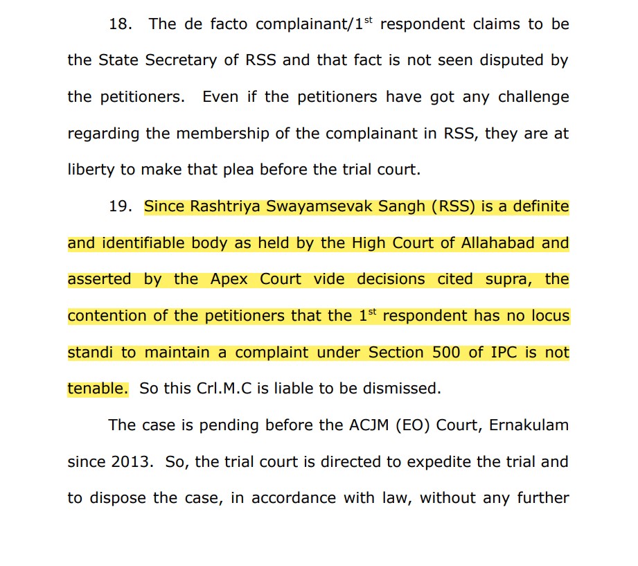 "Since Rashtriya Swayamsevak Sangh (#RSS) is a definite and identifiable body......the contention of the petitioners that the 1st respondent has no locus standi to maintain a complaint under Section 500 of IPC is not tenable." @RSSorg