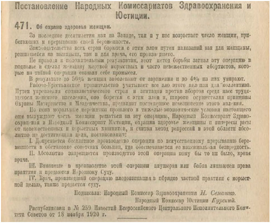 El 18 de noviembre de 1920 la República Soviética Federativa Socialista de Rusia (RSFSR) emitió el decreto “Sobre la interrupción artificial del embarazo”, que garantizó a la mujer el derecho a abortar en cualquier hospital y clínica de forma gratuita y con el “máximo cuidado”.