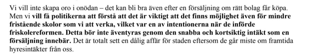 Ägarna kunde inte vara tydligare än så här. Om politiker vill värna om de små friskolorna då kan man inte välja kortsiktiga vinster genom utförsäljning till samhällsfastighetsbolag. En affär som även Västberga Friskola vet på sikt är dålig för staden.