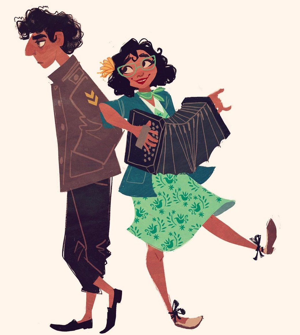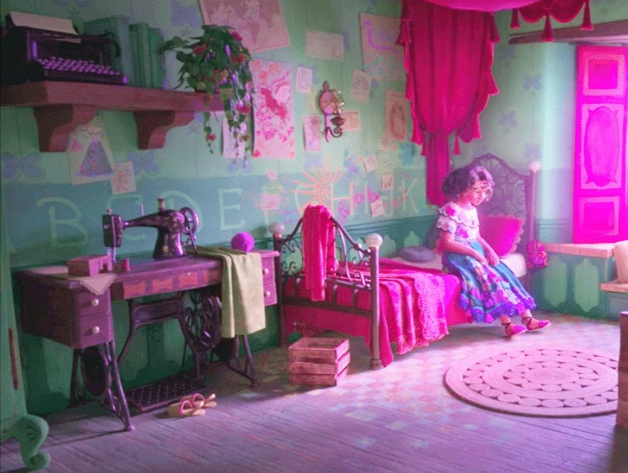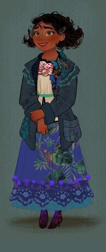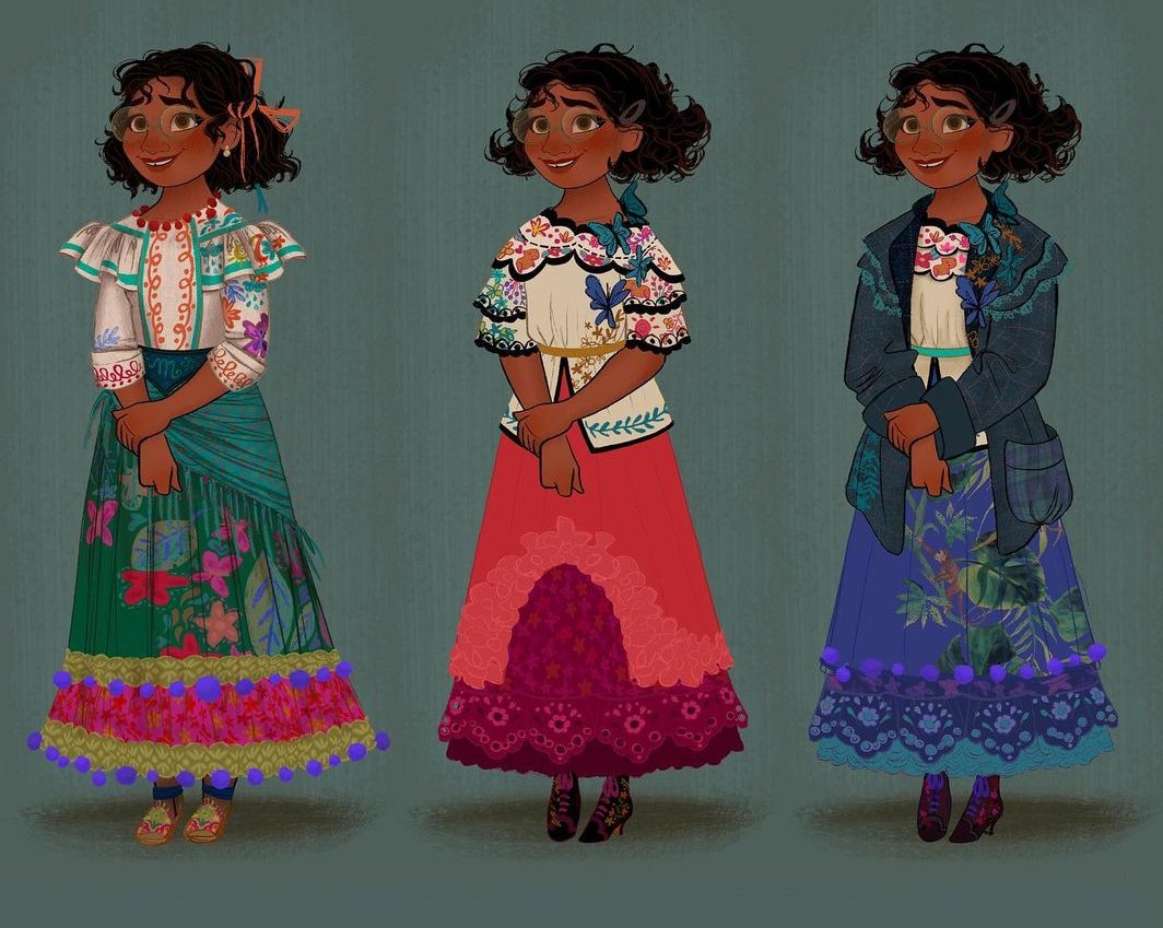 Cuando la historia fue cuajando, decidieron que Mirabel usaría ropa muy recargada. En una familia de personas extraordinarias, es su forma artificial de destacarse: vestirse de manera extraordinaria. Todos expresan su identidad en su ropa, ella debe gritar quién es.