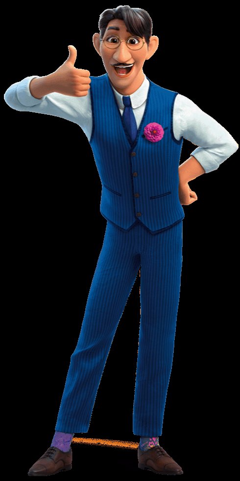Una ñapa que me parece adorable. El vestuario de Agustín (el mejor vestido de la vaina) tiene algo que simboliza a cada una de sus hijas. Flor en la solapa, una media de pesas y otra con los doodles de Mirabel. Solo un trendsetter usaría medias diferentes.