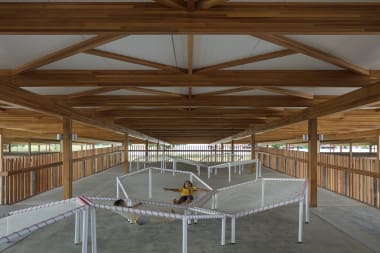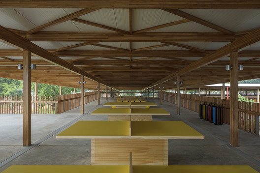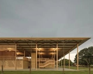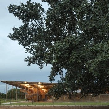 ...Aleph Zero, em colaboração com Marcelo Rosenbaum e Adriana Benguela, do estúdio de arquitetura e design Rosenbaum. Blocos de terra feito à mão no local compõem o prédio arejado, que se enquadra bem na vegetação do local e é próprio para o forte calor da região.