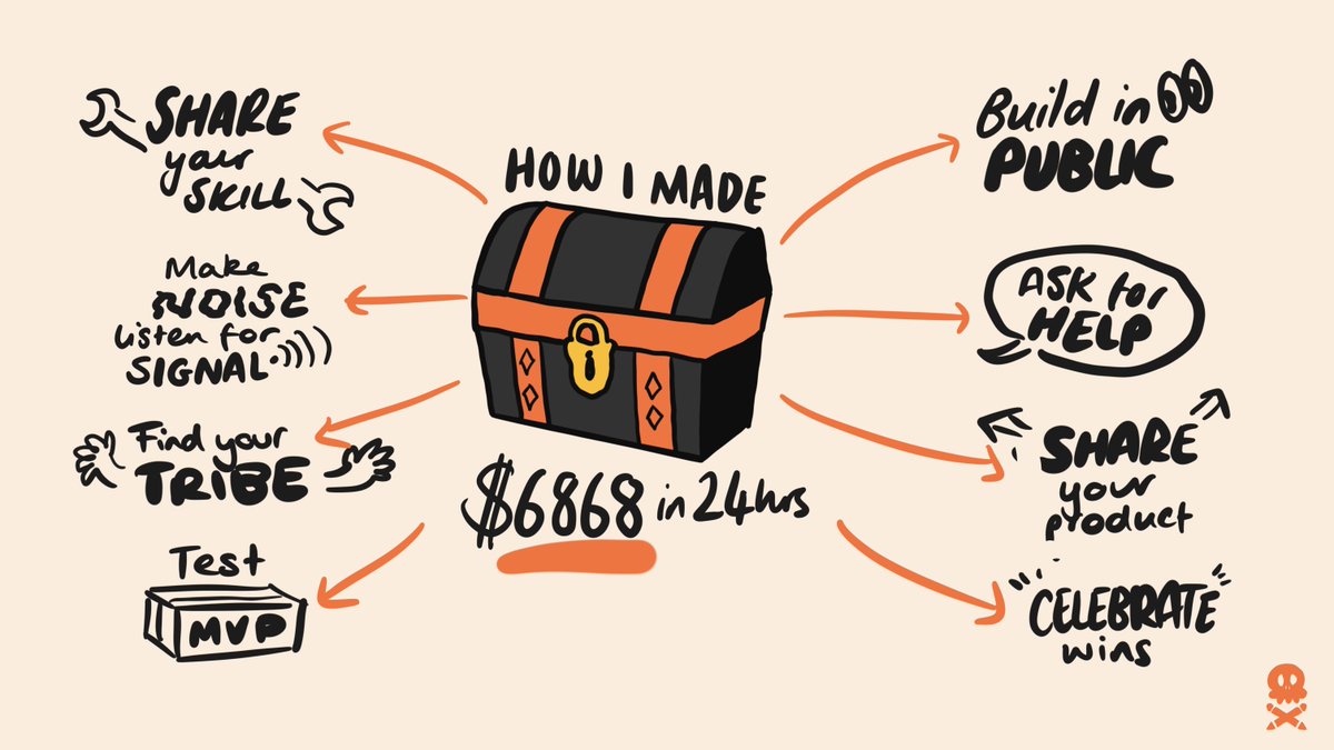 1. Share your high value skill 2. Make noise, listen for signal 3. Find your tribe 4. Test a minimum viable product 5. Build in public 6. Ask for help 7. Share your product 8. Celebrate your wins
