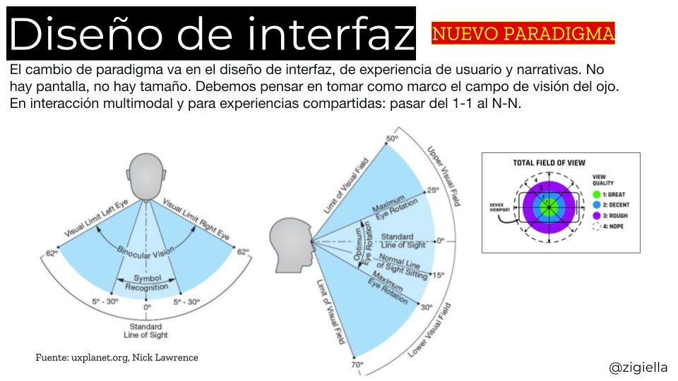 El cambio de paradigma va en el diseño de interfaz, de experiencia de usuario y narrativas. No hay pantalla, no hay tamaño. Debemos pensar en tomar como marco el campo de visión del ojo. En interacción multimodal y para experiencias compartidas: pasar del 1 -1 al N-N. 7/9