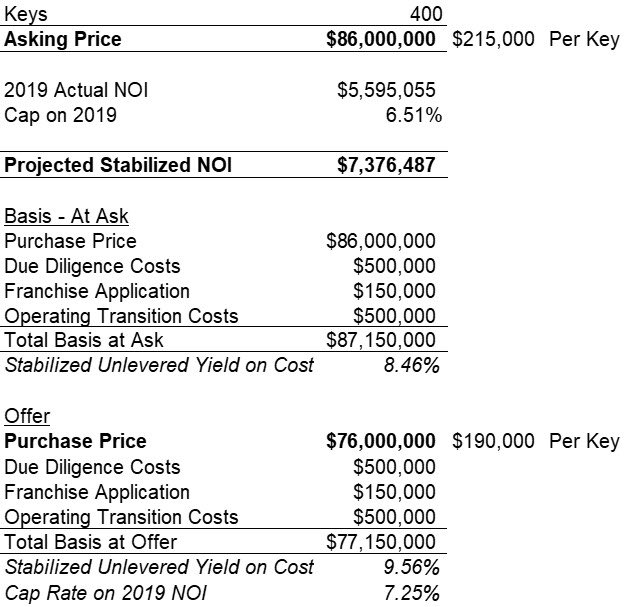I’d like to be closer to a 9.5%, because I think I can sell for a 7% - 7.5%. That puts me at a $190K per key / $76MM number, which is also a 7.25% Cap on 2019… funny how those things work sometimes.