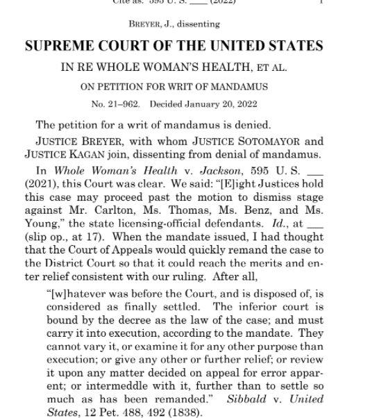 BREAKING: Supreme Court DENIES abortion providers' petition to reignite litigation against Texas abortion ban by ordering 5th circuit to return it to the district court. Apparent vote is 6-3.