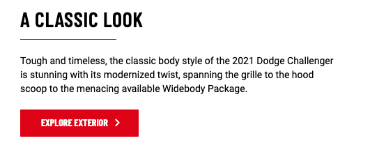 On its exterior, "Tough and timeless, the classic body style of the 2021 @Dodge Challenger is stunning with its modernized twist, spanning the grille to the hood scoop to the menacing available Widebody Package." #DodgeKills