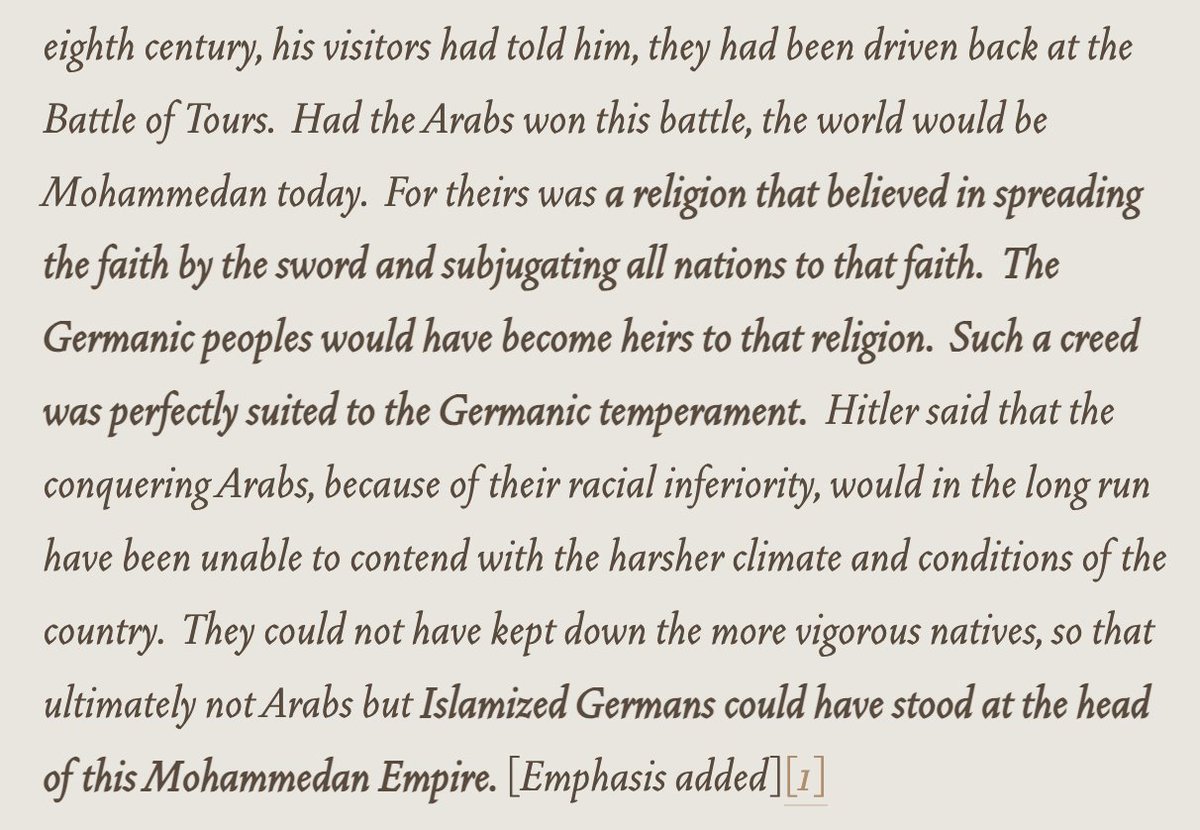 In his talks with Husseini, Adolf openly regretted that Germany did not become Muslim in the 8th c. during Battle of Tours, when Islam almost conquered Europe. He believed Arabs were racially inferior, so Islamized Germans could have headed the global Muslim Empire.