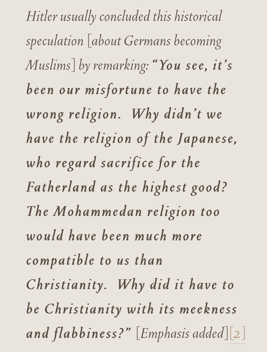 In "Hitler’s Table Talk", a collection of his private, informal words behind closed-doors that were recorded by his closest Nazi aides, Adolf repeatedly expressed contempt for Christianity as a “Jewish invention,” & openly admired Islam, wishing Germans had converted to it.