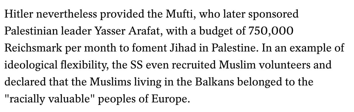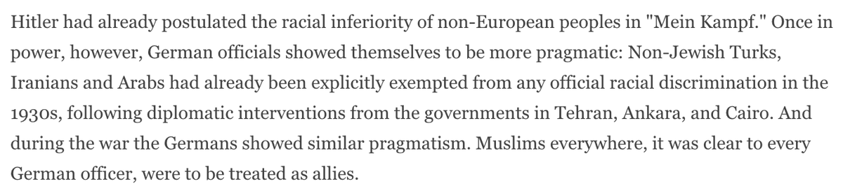 Historian David Motadel, in his book "Islam and Nazi Germany's War," reveals the deep links between the Third Reich & Arab groups. Muslims were treated as allies & explicitly exempted from any racial discrimination by command of the Supreme Leader himself.