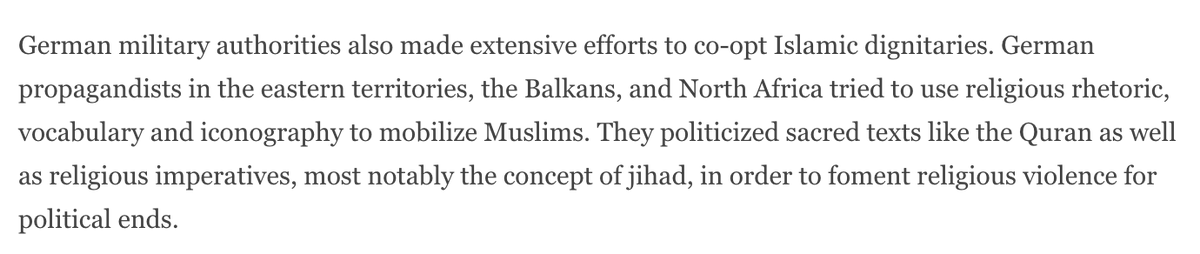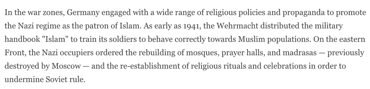 They ordered the rebuilding of mosques, prayer halls, & madrasas to mobilize Muslims. The Wehrmacht army & paramilitary SS recruited tens of thousands of Muslim soldiers to fight on all fronts. They were granted religious concessions & exempted from the ban on ritual slaughter.
