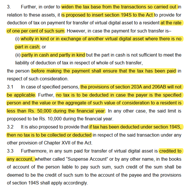 - This section proposes to levy a deduction of tax on payment for transfer of VDAs to a resident at 1% by inserting Section 194S of the IT Act.