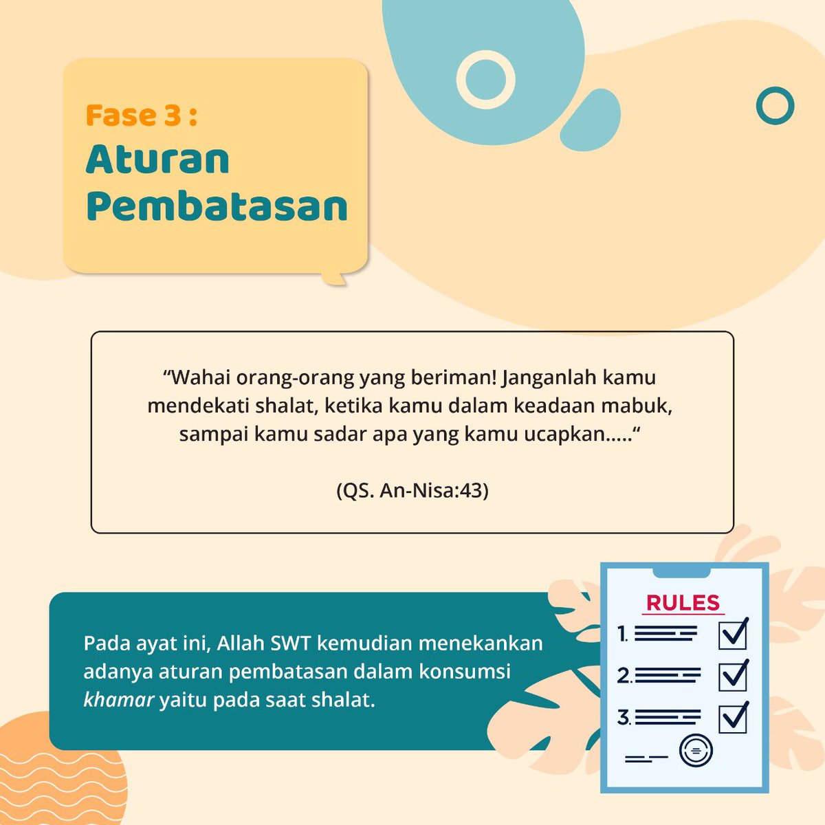 Pembatasan. Sebelumnya sebagian nggak minum khamar krn dosa, fase ini mulai diterapkan larangan pada salat.
