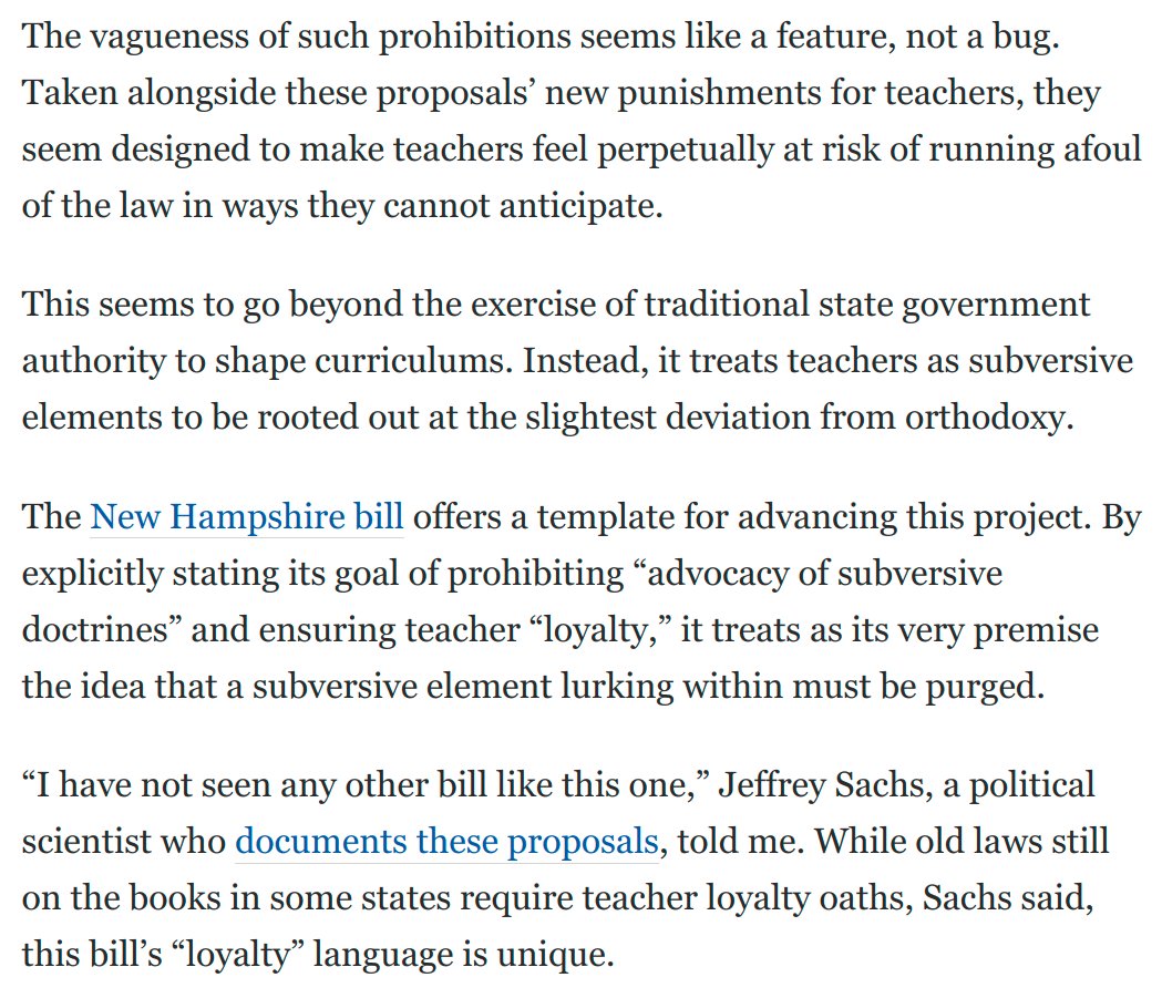 The absurdly vague language of these bills is a feature, not a bug. The idea is to make teachers feel as if they're perpetually on thin ice, treating them like subversive elements that must be rooted out at the slightest deviation from orthodoxy: