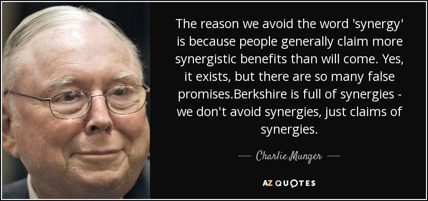 Meanwhile, do NOT buy synergies «as sold» by a management teams without a significant capital allocation track record. Most managers want to build an empire & believe their own lies about synergies. Charlie explains that best with his 60+ years of experience.