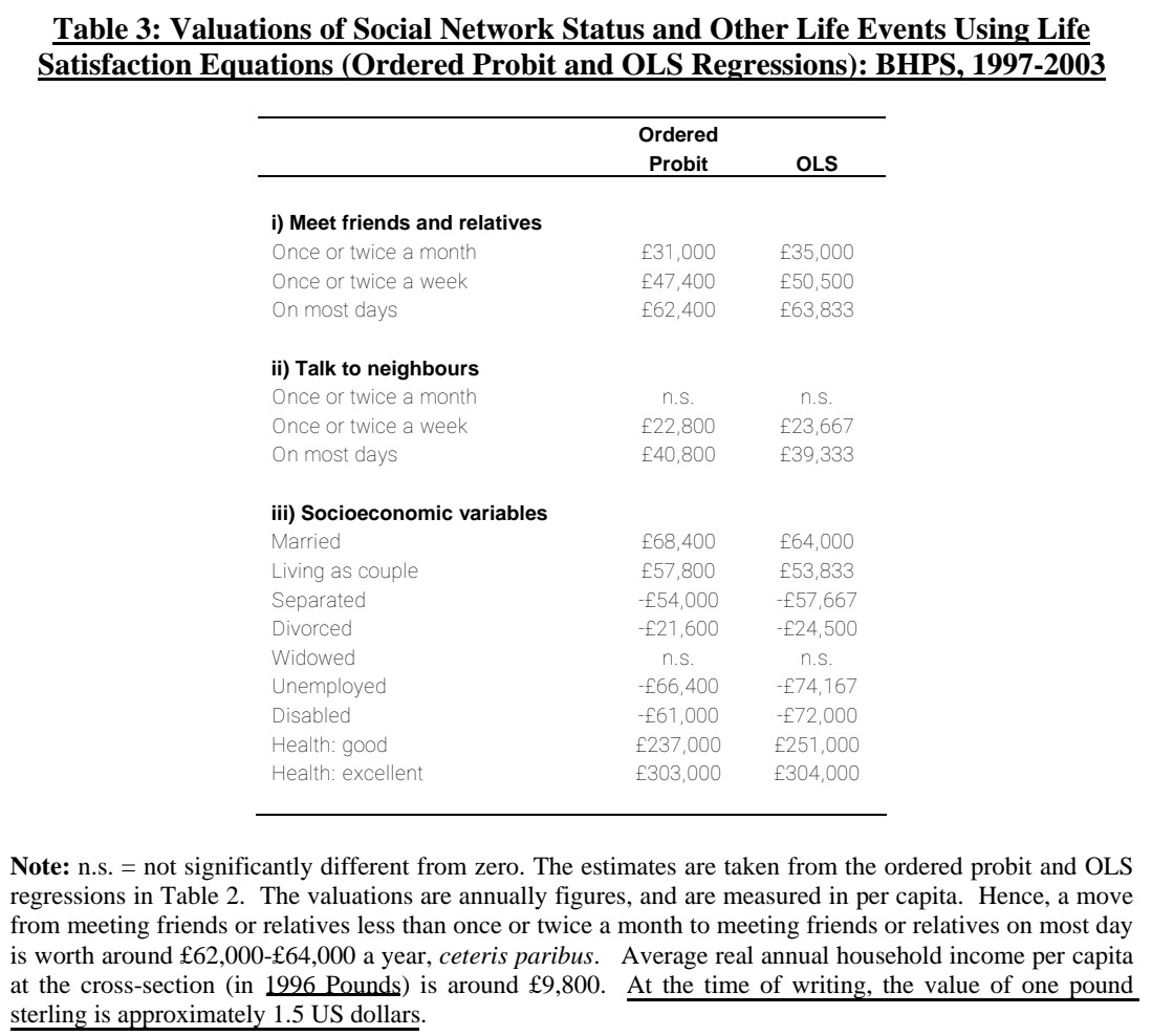 16/ "The extra income required to compensate those who see their friends or relatives only once or twice a week to have the same level of life satisfaction as those who do so on most days is still large (i.e. £85,000 - £69,500 = £15,500 per annum)." [$30,000 in 2022 dollars]