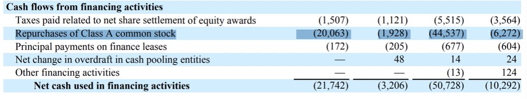 En cuanto el anuncio de recompra de $50B del anterior trimestre, lo han estado cumpliendo, comprando $19b en el Q4 y $44B '21, pero las acciones solo se han reducido un 1% en parte por la dilución por SBC de $9b. Aún tienen $38b disponibles para buybacks y 40b en caja.
