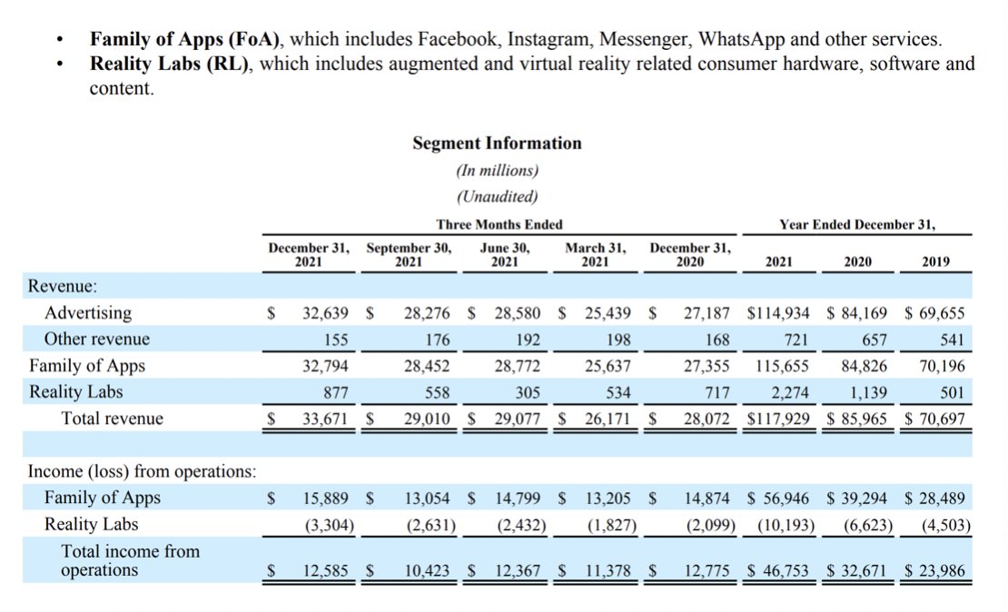Lo bueno es que su negocio de ads a pesar del gasto siguen con márgenes operativos altos y crecimiento interanual en MAUs, DAUs y ARPU, pese estar por debajo de consenso y su %EBIT total bajar al 37% debido al aumento de inversiones en Reality Labs, que ya comentaron en el Q3.