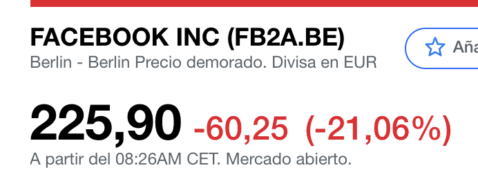 Como sabéis Facebook , también cotiza en Alemania , donde esta mañana a abierto reflejando la caída de la cotización en el after hours, el ticker en Alemanina es $FB2A