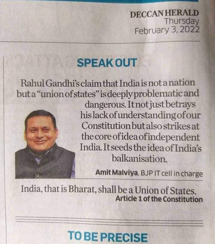 कल हमने इस बारेमें की देश"यूनियन ऑफ़ स्टेट्स"क्यों बना इसपर लम्बी सारी पोस्ट लिख डाली और इसका फायदा क्या रहा पिछले70सालमें वो भी कवर किया,क्यूंकि हमें मालूमथा के कोई ना कोई मंदबुद्धि चड्डी जिसने संविधान नहीं पढ़ रखा होगा वो पक्का राहुलसे कहेगाके राहुलने संविधान नहीं पढ़ रखा है।