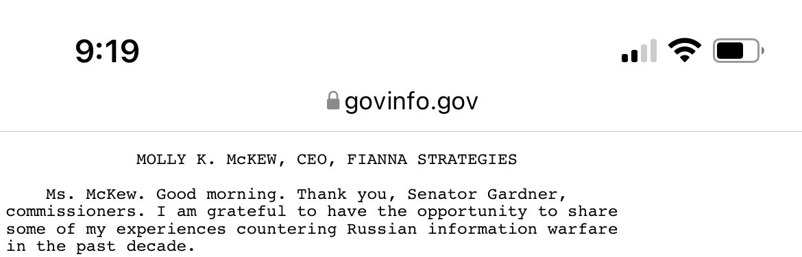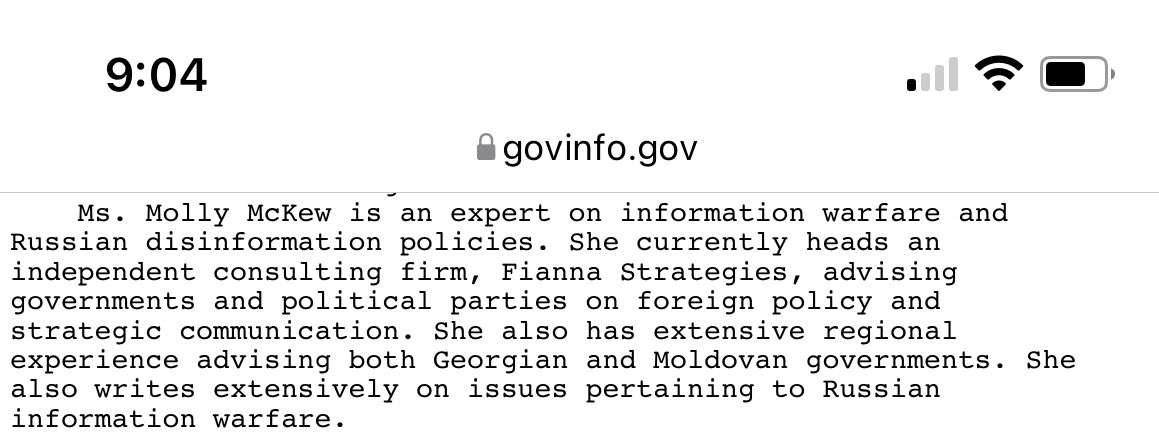 In 2017 @MollyMcKew testified in a Senate hearing on Russian disinfo. Her bio claim she worked for the Moldovan govt. I asked Moldova to confirm McKew’s claim, and they could find no record she’d worked or advised the Moldovan PM or govt.